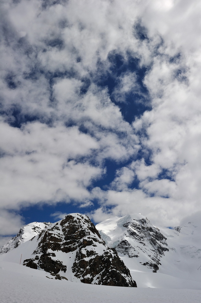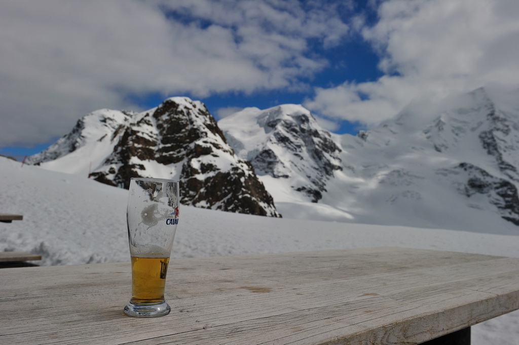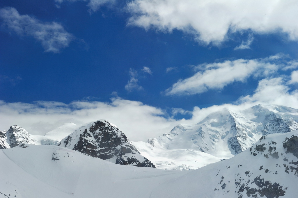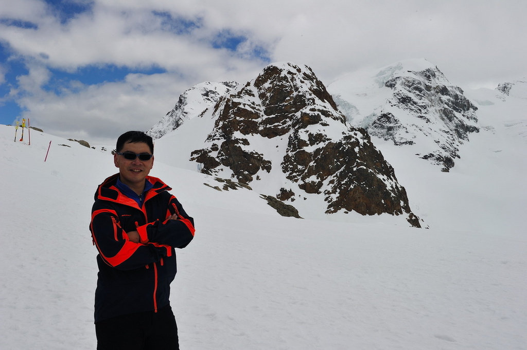我們到山頂時就被一大片白雪所震懾,在台灣高山5月還有雪是一件大事,在瑞士是算正常的。剛抵達時天空的藍天並不多,隨著要離開這雪地時藍天露出的愈來愈多,景色愈來愈美,白雪能配上藍天是最棒的了,我們更捨不得離開,快門一直按,連老師拿起相機狂拍,先叫隊員先去等纜車,自己忍不住一直拍。可見當下有多美。