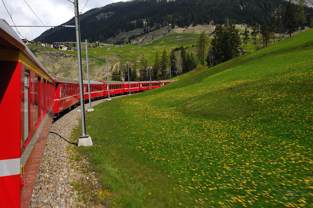 在完成通關及瑞士國鐵旅遊券啟用後,在車站先換一些瑞朗就坐上雙層火車再接紅吱吱的伯尼納特快車( Bernina Express )往聖莫里茲去,伯尼納特快車是縱穿阿爾卑斯山進入義大利,從格勞賓登州的庫爾 ( chur ) 或 聖莫里茲 (St.Moritz ) 一直到達義大利境內的提拉諾 Tirano,從海拔 201 公尺到 2253 公尺,窗外的風景及好天氣令我一定要拉下窗戶拍照,不拍對不起自己。同時耳邊不時傳來團員按下快門的聲音,大家都被眼前美景給深深吸引住,美呆了!